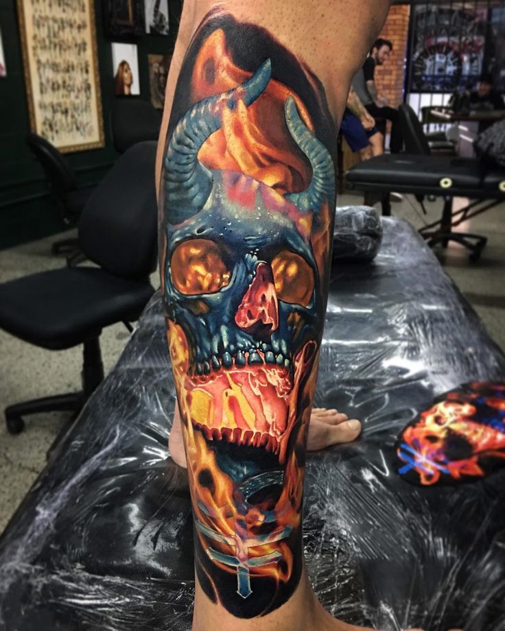 Джентльмены так же нередко запрашивают череп в огне. Тату указывает на быстротечность жизни, служит напоминанием, что нужно ценить каждый миг.
