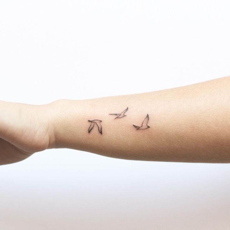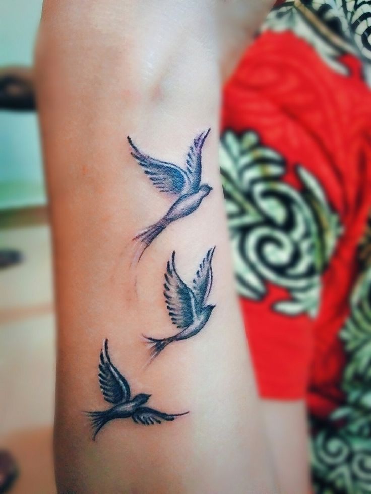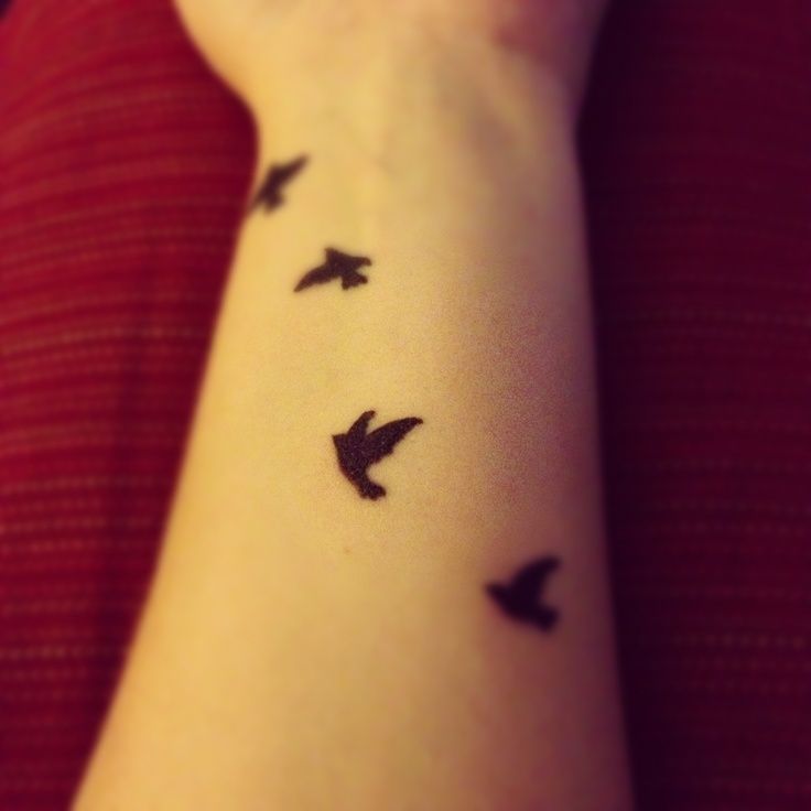 Чаще всего татуировку можно повстречать на телах молодых девушек. Она представляет собой изображение стаи птиц, летящих вдаль. Тату “летящие птицы” на руке обозначает стремление к мечте, веру в хорошее будущее.