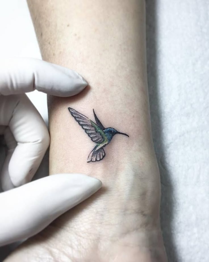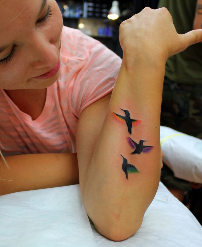 – А вот колибри наносят исключительно дамы. Эта птица свидетельствует об открытости, а также экзотичности ее обладательницы. Татуировка обозначает любовь к жизни и свободе. Для неё часто используются яркие, контрастные сочетания цветов.