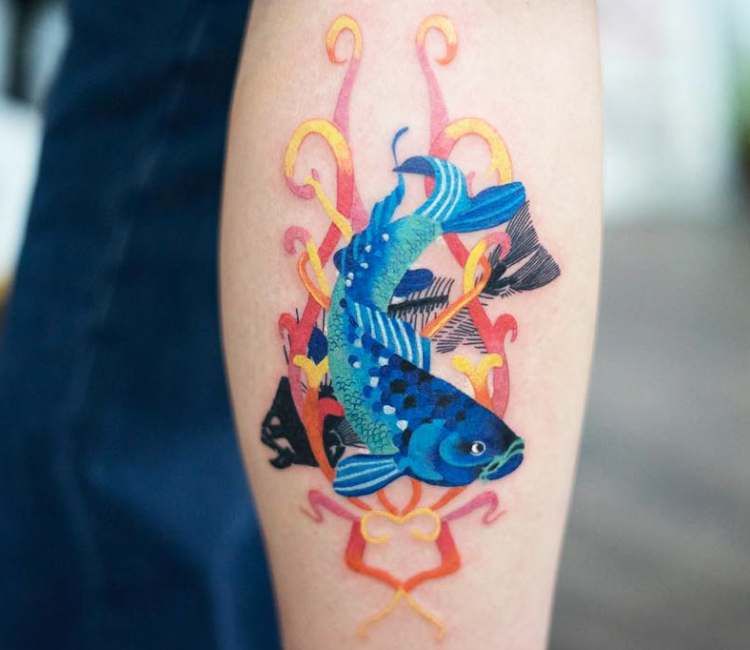 В азиатской культуре распространены тату Карпа Кои. Правда, у других народностей они тоже имеют место быть. Кому не достает удачи, решимости, тату японских рыбок Кои будет в самый раз. Заодно рыбка притянет любовь и сердечную привязанность.