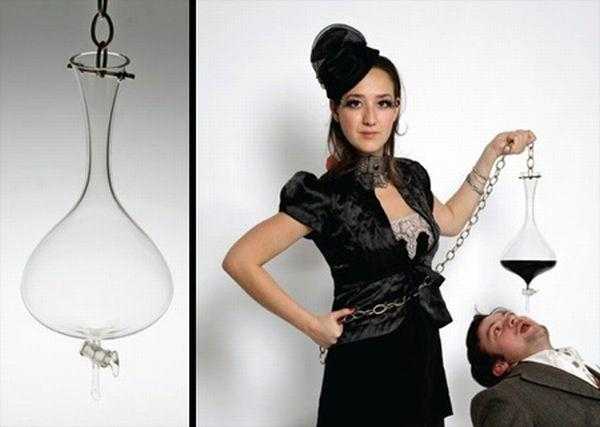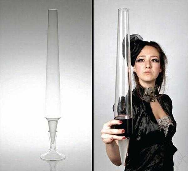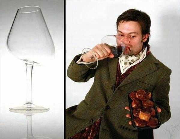 Из бокала-обжорства, пожалуй, пить проще всего. Единственное его отличие от обычного – ассиметричная форма, напоминающая пухлый живот любителя покушать. В бокал помещается больше, чем обычно, но выглядит он специально отталкивающе, некрасиво, как всегда со стороны видится обжорство.