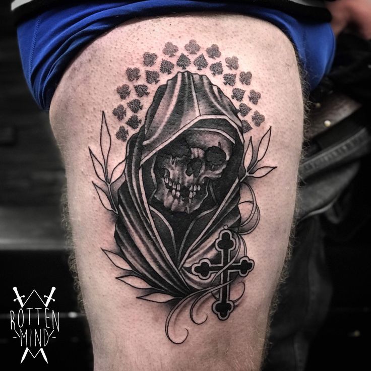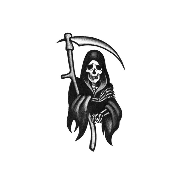 Считается, что смерть отступает, испугавшись собственного изображения. Чаще всего клиенты выбирают символ скелета в черно-белых тонах, одетого в длинный плащ и держащего косу в руках. Популярные стили нанесения – блэкворк, традишнл.