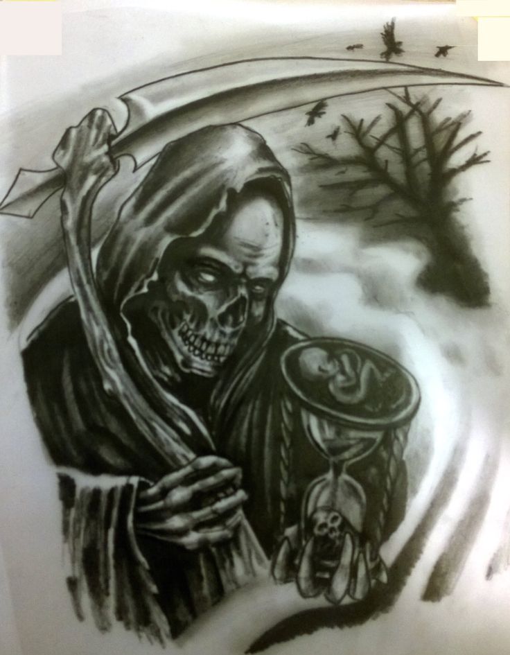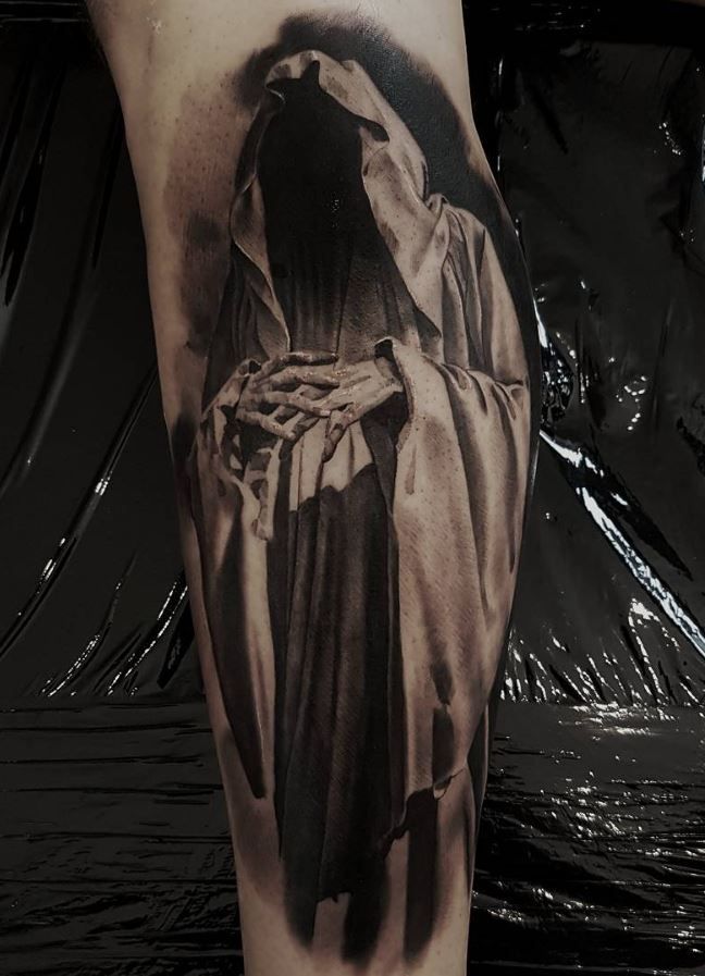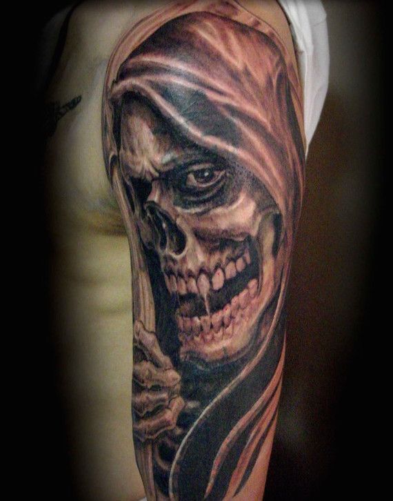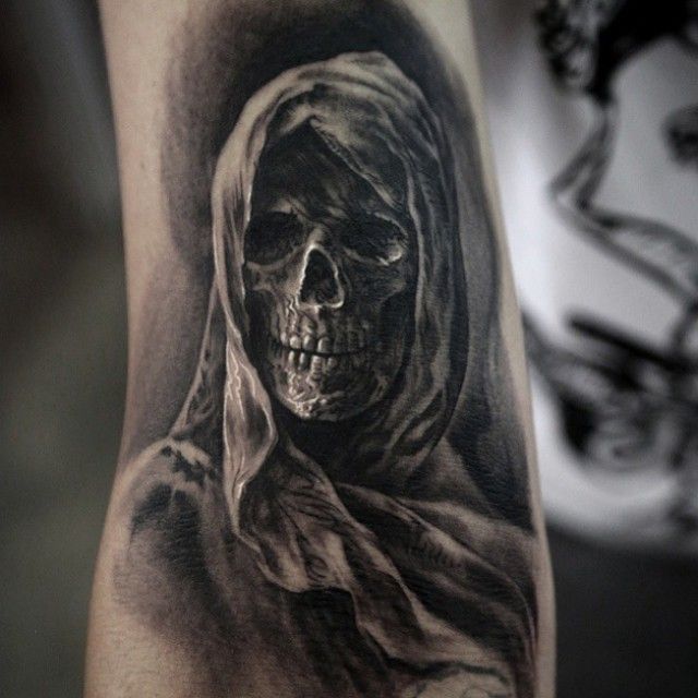 Татуировка «Смерть» должна передавать сумрачную атмосферу, поэтому в большинстве случаев выполняется в черно-белых тонах.