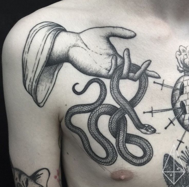 В обычной жизни такие татуировки выбирают врачи. В древнегреческой мифологии бог врачевания Асклепий носил с собой яд змей и нож, чтобы вовремя помочь больным.