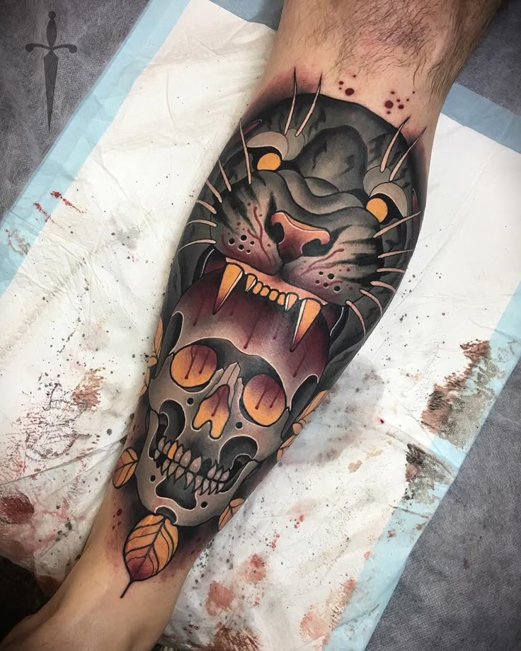 Тигр-людоед представляет собой очень реальную угрозу, и эта татуировка отражает страх и запугивание, которыми владеет это существо. Это изображение дьявольского тигра, держащегося за человеческий череп. Использование красного цвета делает эту татуировку еще более отрезвляющей.