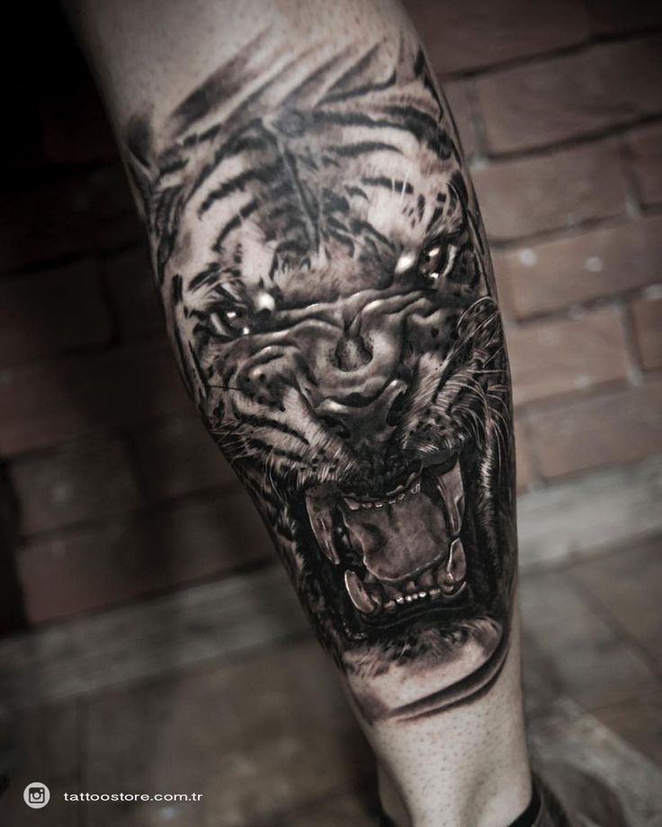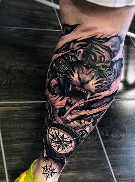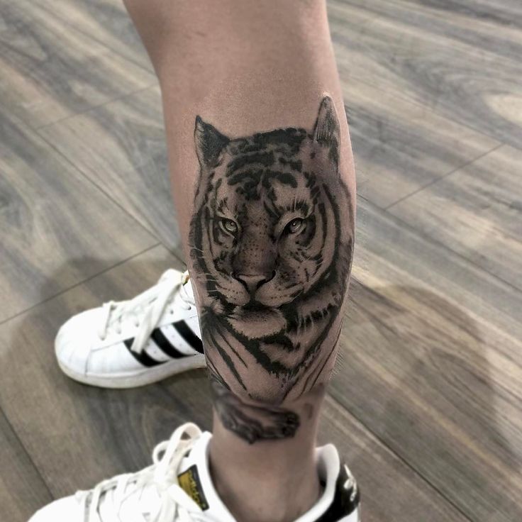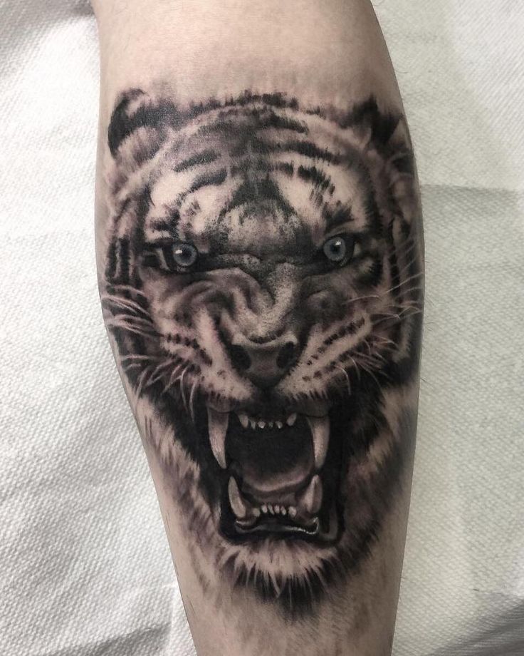 Ревущий тигр — одна из самых популярных татуировок тигра у парней. Как показывает эта часть икры, дизайн татуировки можно переделать и переориентировать, чтобы он подходил практически к любому месту на теле. Эта конкретная татуировка ревущего тигра использует черный и серый цвета, чтобы сфокусировать внимание на портрете и добавить ощущение темноты и опасности.