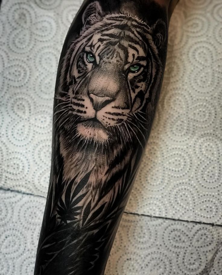 Эта черно-серая татуировка тигра отлично подходит для предплечья или икры. Более темные цвета, использованные для тела тигра, и полосы делают ярко-желтые глаза действительно яркими. Этот татуированный зверь передает мужественность, силу и контролируемую агрессию.