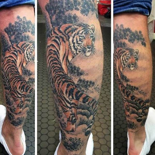Еще одна из множества татуировок тигра для мужчин, вдохновленных японским искусством и самурайской культурой. Эта татуировка уподобляет прыгающего тигра гремящим волнам в ярких, но мягких тонах. Идеальная часть руки или ноги, эта татуировка приносит владельцу чувство ярости и силы.