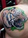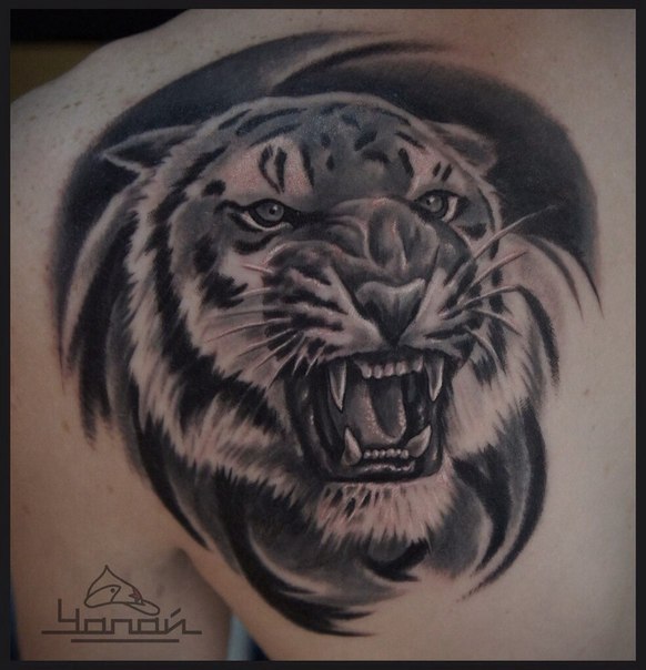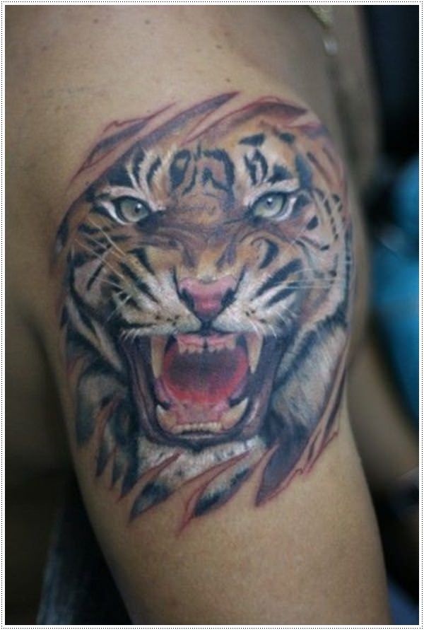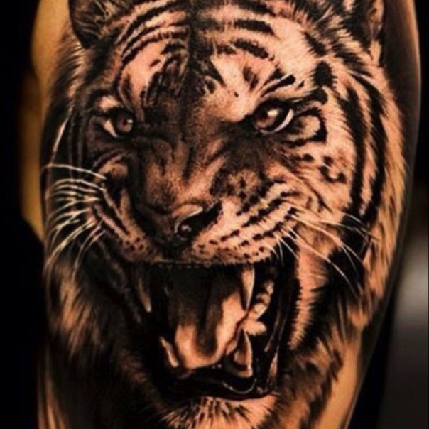 Чаще, чтобы заявить о своей власти, силе духа и характера тату тигра изображают на плече в реалистичном варианте. Запечатленный хищник в прыжке означает движение к победе, несмотря на преграды на пути. Хозяин такой татуировки не остановится на половине дороги к своей цели.