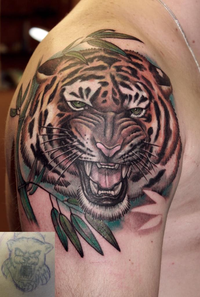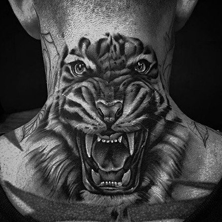 Большая наколка с головой тигра подчеркивает интеллектуальность и