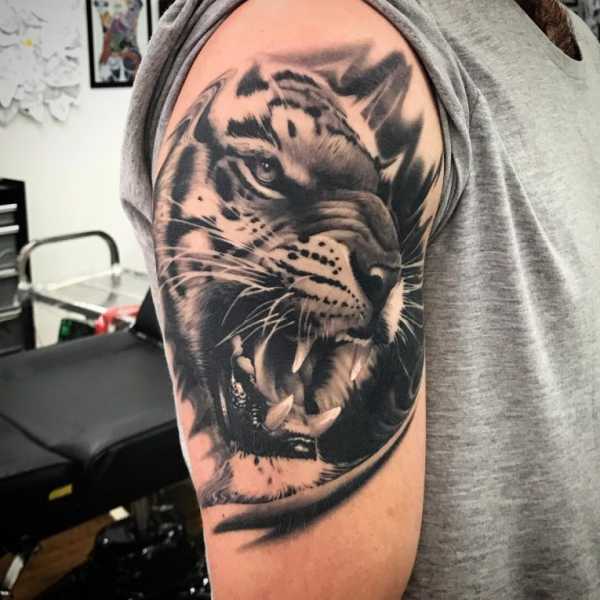 Тату “тигр” (оскал) прекрасно подходит для нанесения на предплечье или плечо, говорит о том, что его носитель по натуре сильный и уверенный человек.