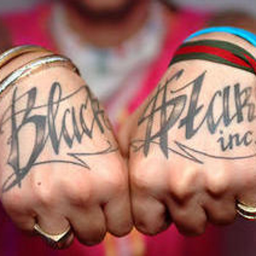 На теле художника довольно много разных надписей. Здесь можно увидеть знаменитую татуировку футбольных хулиганов – ACAB или все менты сволочи, несколько линий на руке, арабское слово “Гашиш”.