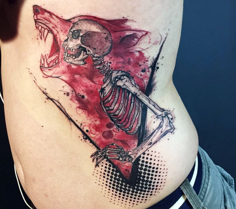 Стиль татуировки трэш-полька представляет собой хриплый подход к боди-арту, который сочетает в себе различные стили линий в оттенках серого и черного, подчеркнутых ярко-красными вкраплениями.
