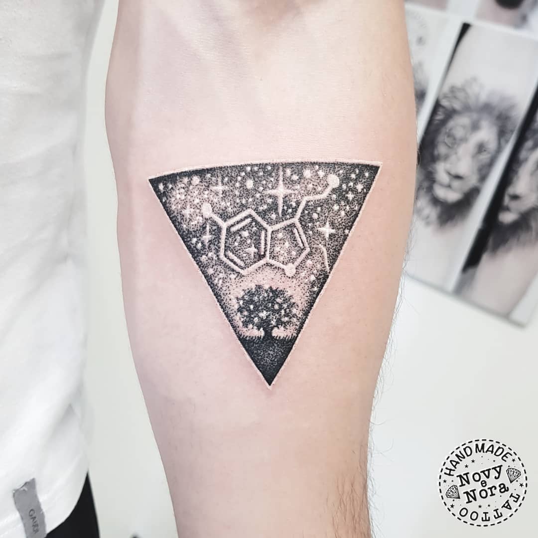 В этой татуировке с треугольной парой есть две вещи. Призма и треугольник. Это хороший контраст с тем, что мы видели в других дизайнах. Это не обязательно должен быть простой треугольник.