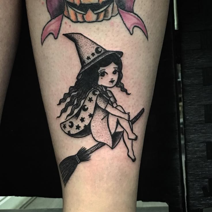 3 Маленькая ведьма и летающая метла.Вот доказательство того, что тату ведьмы могут быть крутыми и очаровательными одновременно. Эта крошечная ведьма и ее летающая метла отмечены знаком одобрения WitchEmoji.
