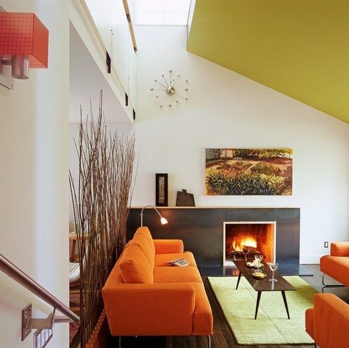 Современно смотрится композиция, окрашенная в цвет, повторенный в интерьере. Креативно выглядит, если при украшении комнаты использована полосатая ткань, цветом повторяющая окраску веток.