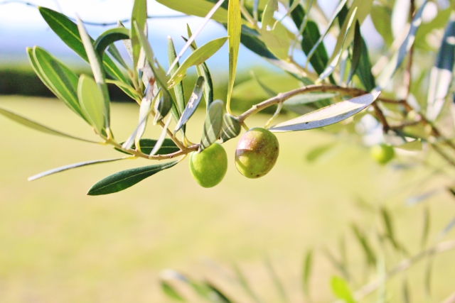 Ветка итальянских оливок крупным планом, производство оливкового масла первого отжима, настоящие био зеленые оливки.
