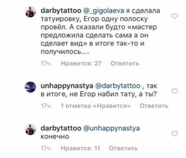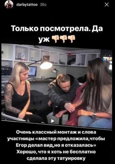 — Очень классный монтаж и слова участницы «мастер предложила, чтобы Егор делал вид, но я отказалась». Хорошо, что я хоть не бесплатно сделала эту татуировку, — написала она в соцсетях, но потом, правда, пост удалила.