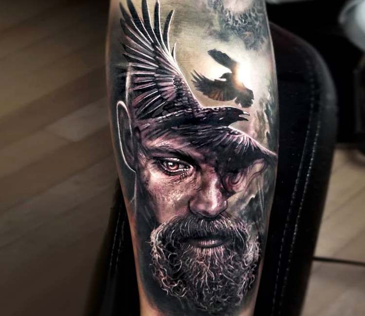 Человек, миф, легенда. прям гипербола!) Сам Один. Он положил глаз на знания, и он знает, что Один — это потрясающая идея татуировки викингов. На тату ниже он наблюдает из-за облаков, как ладья викингов пересекает море, предположительно направляясь грабить дерьмо из какого-то маленького приморского городка…