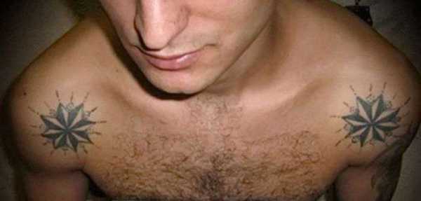 Звезда – еще одна наколка вора в законе. Причем авторитетного. Располагаются такие рисунки чаще всего под ключицами или же на коленях (что говорит о том, что заключенный ни перед кем на колени не становится). Нужно также отметить, что заключенные, имеющие такие татуировки, не могут просить об уменьшении своего срока наказания. Также они никогда не сотрудничают с представителями правоохранительных органов.