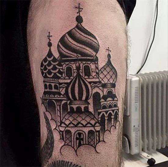 «Храм с куполами — одна из самых распространенных тюремных татуировок. Когда человек попадает в тюрьму — ему набивают купол. Когда он полностью отбывает свой срок — на куполе появляется крест. Татуировка с куполами без крестов у человека на свободе сразу вызывает много вопросов; люди «в теме» однозначно будут смотреть на него с подозрением».