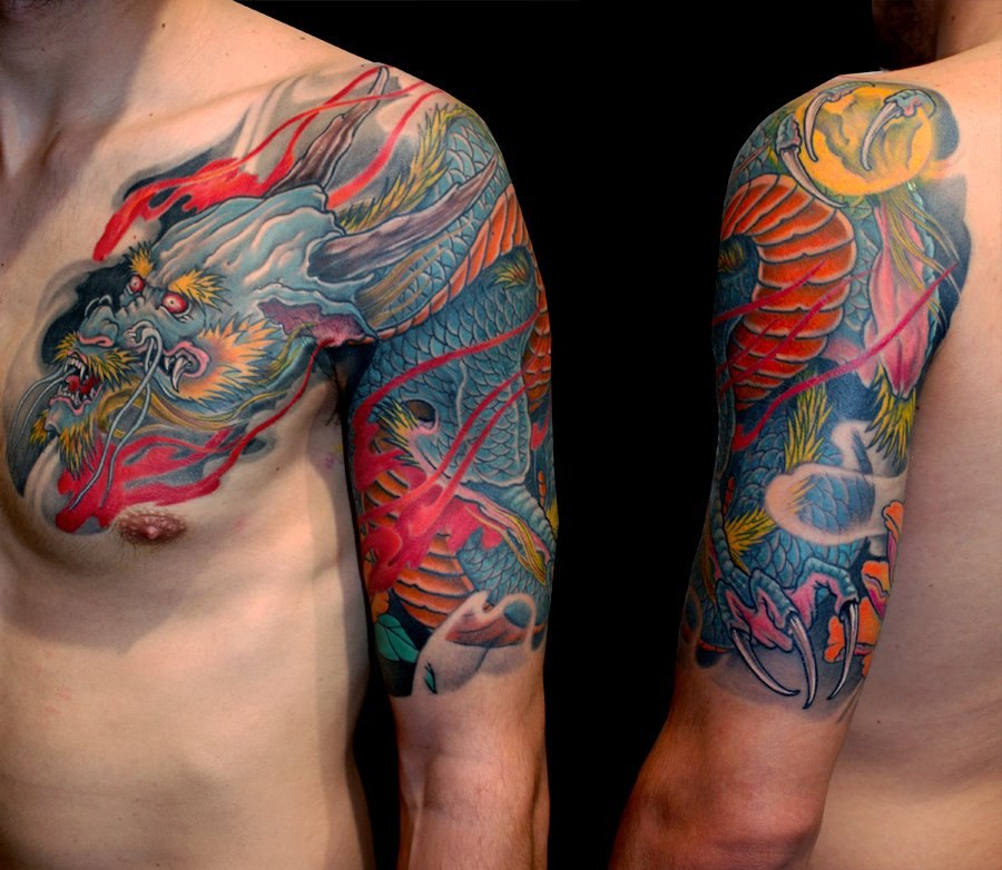 ΠΠΎΠ»ΡΠ±ΠΎΠΉ Π΄ΡΠ°ΠΊΠΎΠ½ ΡΠ°ΡΡΠΈΡΠΎΠ²ΠΊΠΈ ΡΠΈΠ½ΠΈΠΉ / Π·Π΅Π»Π΅Π½ΡΠΉ ΠΡΠ°Ρ Π΅Π½ΡΠΊΠΈΠ΅ ΡΠ°ΡΡΠΈΡΠΎΠ²ΠΊΠΈ Π² ΡΠΏΠΎΠ½ΡΠΊΠΎΠΌ ΡΡΠΈΠ»Π΅ Π½Π° Unterarm, Elbogen und Bizeps eines weiΓen Mannes, der auf schwarzem Hintergrund isoliert ist.