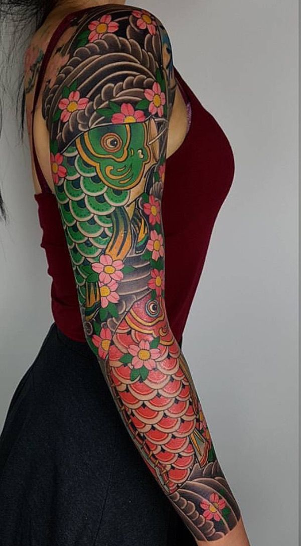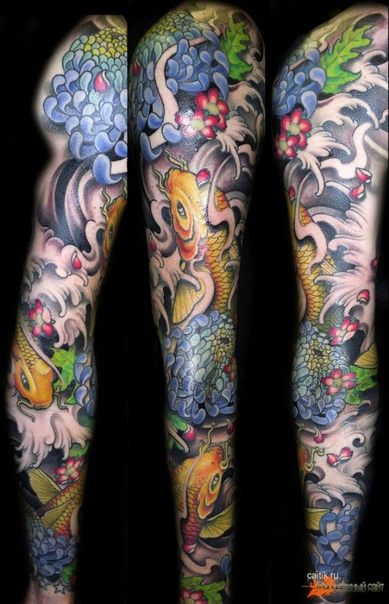 Легенда о рыбах кои состоит в том, что они превращаются в драконов, поэтому рыбы кои – очень популярные татуировки на рукавах, так как одна рука говорит о первой части, а другая – о второй, или вы можете поместить всю историю в одну руку.