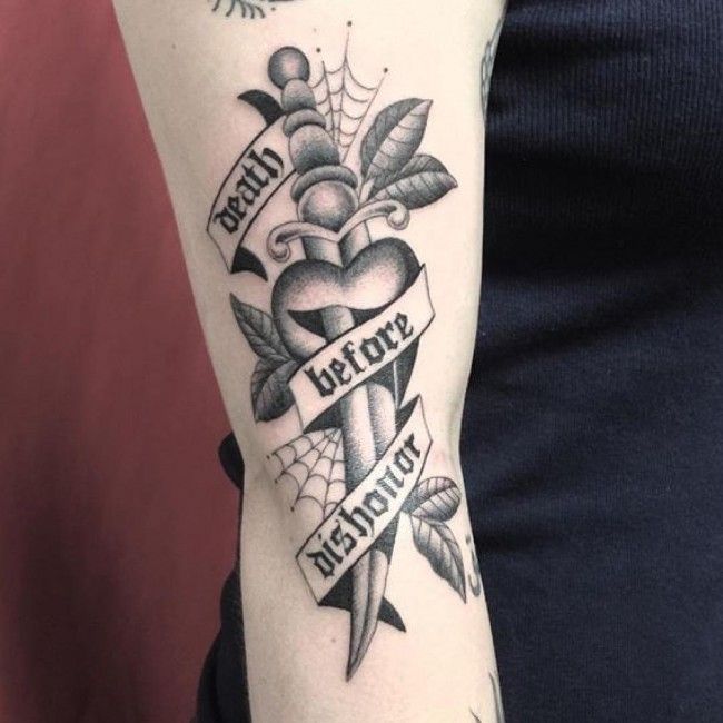Ножи и кинжалы. Татуировки с изображениями ножей часто интерпретируют как оружие, а в следствии – жестокость. Но чаще всего такие татуировки означают власть, преимущество, независимость. Но ножи также могут означать идеал, совершенство. Некоторые татуировки с ножами символизируют эмоциональность, острый ум, остроумие, сексуальность и раскованность. Ножи иногда ассоциируют с танцем, изяществом, ловкостью и грацией.