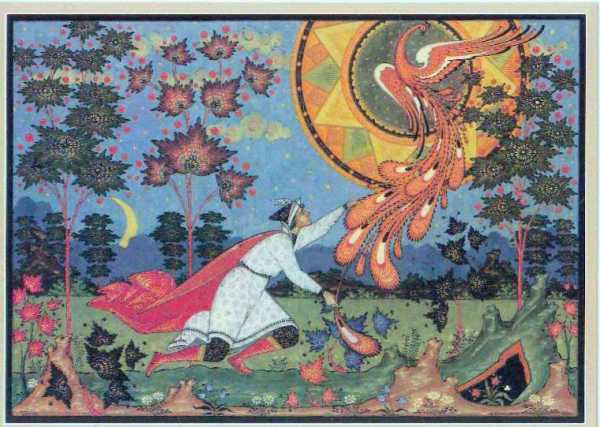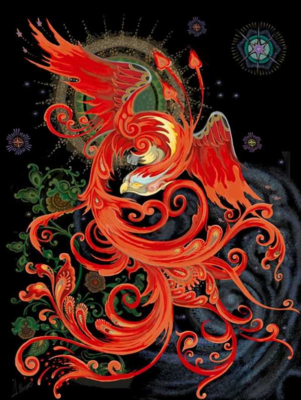 Но при этом описание ее весьма сходно. «Воздух расцветился всеми цветами радуги, от перьев и крыльев птицы шли красивые звуки, от нее исходил приятный запах…» — так было сказано о чудесной птице Симург в арабском трактате 13 века. «Есть там другая священная птица,… и имя ей Феникс, – писал Геродот. — Ее облик и стать весьма напоминают орла, а перья у нее частью золотистые, частью красные». «Киноварная птица, вещество пламени», «его цвет радует глаз, его гребень выражает праведность, его язык искренен» — говорили китайцы, имея ввиду Фэн-хуан, властителя Юга. Птица-огонь, — говорили славяне о Жар-птице, — об ее оперение можно запросто обжечься. Каждое перо же светится, как множество свеч, и остро, крепче булата. А сама же она сияет то голубым, то малиновым светом, а глаза ее напоминали блестящие кристаллы.