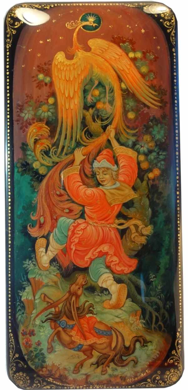 В восточнославянской сказке Жар-Птица – чудесная птица, размером с павлина. Перья жар-птицы светят голубым светом, а подмышки малиновым. Об ее оперение можно запросто обжечься. Выпавшее перо еще долгое время сохраняет свойства оперения Жар-Птицы. Оно светится и дает тепло. А когда потухнет перо, то оно превращается в золото. Жар-Птица стережет цветок папоротника. Золотая окраска Жар-Птицы, ее золотая клетка связаны с тем, что птица прилетает из другого (“тридесятого”) царства, откуда происходит все, что окрашено в золотой цвет. Жар-Птица может выступать в роли похитителя, сближаясь в этом случае с Огненным Змеем: она уносит мать героя сказки “за тридевять земель”. Можно предположить древнюю связь Жар-Птицы и словацкой “птицы-огневика” с другими мифологическими образами, воплощающими огонь, в частности с Рарогом, огневым конем – птицей, Огненным Змеем.