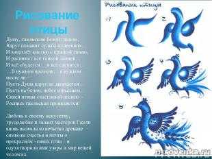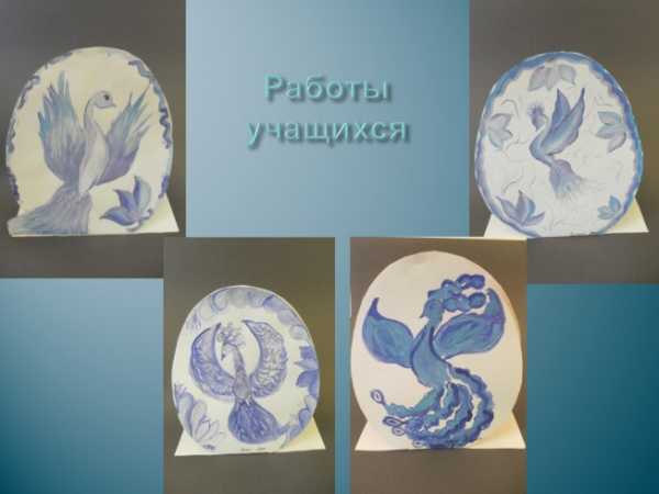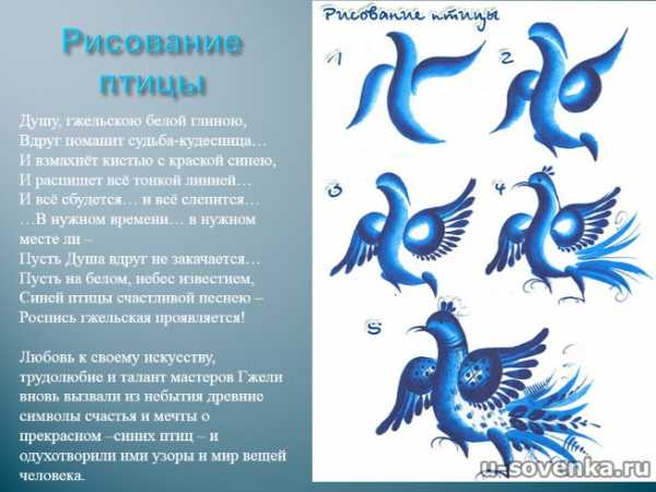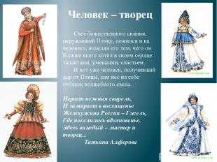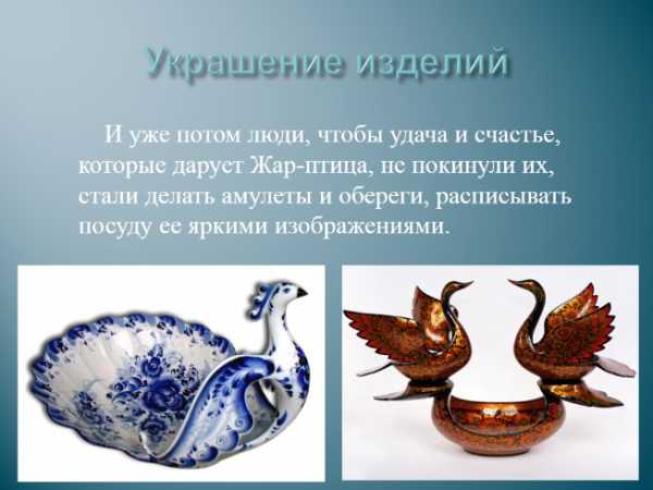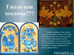 Какого цвета жар-птица?Плотникова С.Н., учитель изобразительного искусства ГБОУ СОШ 854 г. Зеленограда Образ жар-птицы Неча молвить, страх красивы!Ножки красные у всех;А хвосты-то — сущий смех!Чай, таких у куриц нету.А уж сколько, парень, свету,Словно батюшкина печь!»-Ярким пламенем сверкая,Встрепенулася вся стая,Кругом огненным свиласьИ за тучи понеслась.Образ в сказке «Конек-Горбунок» весьма сходно для разных народов: «…воздух расцветился всеми цветами радуги, от перьев и крыльев птицы шли красивые звуки, от нее исходил приятный запах…»Описание Птицы Голубая или золотая???Голубая или золотая??? Гжель или хохлома??? Славяне связывали Жар-птицу с золотом и кладами, считая, что птица указывает на них. Где она опустится, там в земле сокровища и таятся. Иногда говорили, что в купальскую ночь Жар-птица спускается на землю, и именно ее сияние принимают за цветок папоротника. Образ Жар-птицы в сказках Птица-огонь, – полагали славяне, подразумевая Жар-птицу, – об ее оперение можно запросто обжечься. Каждое перо же светится, как множество свеч, и остро, крепче булата. А сама же она сияет то голубым, то малиновым светом.Птица-огонь Увидеть ее, преодолев множество испытаний, мог лишь отчаянный смельчак с чистыми помыслами, ведомый по жизни мечтой. Недаром иногда называли Птицу Жар-птицей, ведь жар, огонь – это и творчество, и творение, и «горение».Жар, огонь – это творчество… Свет божественного сияния, окружавший Птицу, ложился и на человека, наделяя его тем, чего он больше всего хотел в своем сердце: талантами, умениями, счастьем. И вот уже человек, получивший дар от Птицы, сам нес на себе отблеск волшебного света. Играет нежная свирель,И замирает в восхищеньеЖемчужина России – Гжель,Где поселилось вдохновенье.Здесь каждый – мастер и творец… Татьяна АлфероваЧеловек – творец Украшение изделий И уже потом люди, чтобы удача и счастье, которые дарует Жар-птица, не покинули их, стали делать амулеты и обереги, расписывать посуду ее яркими изображениями. Сине-голубая гжельПоверить трудно: неужелиВсего два цвета? Чудеса!..Вот так художники из ГжелиНа снег наносят небеса!Л. Куликова. Гжельская роспись – это древнее, традиционно русское искусство, истоки которого зародились в русской глубинке уже более 670 лет назад. «Нежно-голубое чудо – сказочная гжель» – так ласково называли люди на Руси – всем полюбившуюся, удивительно украшенную керамику из белоснежной глины. Без сомнения, гжельская посуда, сувениры и игрушки – эти уникальные самобытные произведения искусства – испокон веков и по сегодняшний день очень ценятся во всем мире. На чем выполняют роспись художники?На керамике: фарфоре, фаянсе. Освоили также технику майолики.Роспись часто дополняется Скульптурными изображениями людей, животных, птиц.
