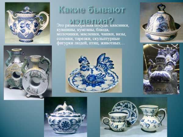 Какие бывают изделия? Это разнообразная посуда: квасники, кувшины, кумганы, блюда, молочники, масленки, чашки, вазы, солонки, тарелки, скульптурные фигурки людей, птиц, животных…