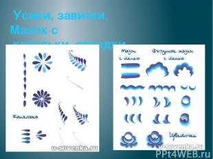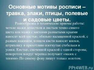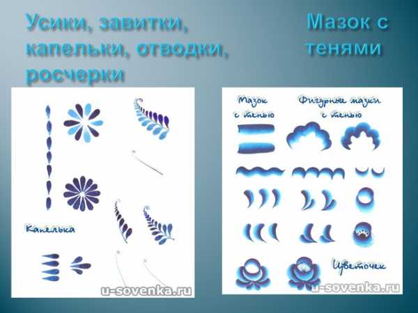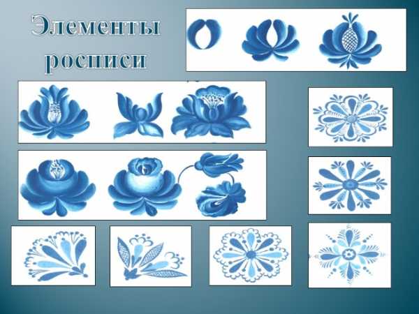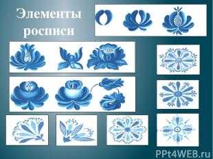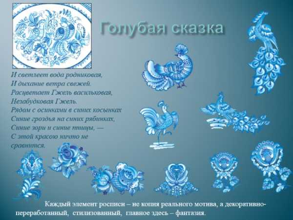 Натюрморт с васильками Игорь Белковский Голубая сказкаИ светлеет вода родниковая,И дыхание ветра свежей.Расцветает Гжель васильковая,Незабудковая Гжель.Рядом с осинками в синих косынкахСиние гроздья на синих рябинках,Синие зори и синие птицы, —С этой красою ничто не сравнится. Каждый элемент росписи – не копия реального мотива, а декоративно-переработанный, стилизованный, главное здесь – фантазия. Элементы росписи – это разнообразные сеточки, прямые и волнистые линии Усики, завитки,