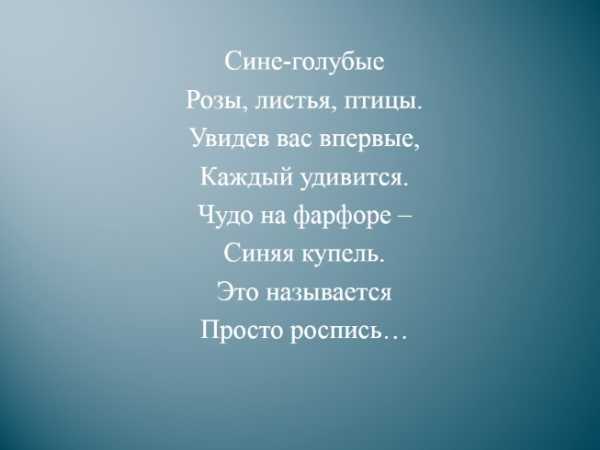 Поверить трудно: неужели Всего два цвета? Чудеса!.. Вот так художники из Гжели На снег наносят небеса! Л. Куликова.
