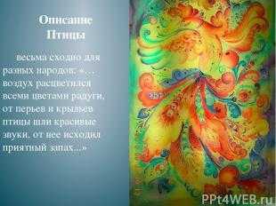 весьма сходно для разных народов: «…воздух расцветился всеми цветами радуги, от перьев и крыльев птицы шли красивые звуки, от нее исходил приятный запах…»