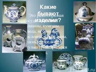 Это разнообразная посуда: квасники, кувшины, кумганы, блюда, молочники, масленки, чашки, вазы, солонки, тарелки, скульптурные фигурки людей, птиц, животных…