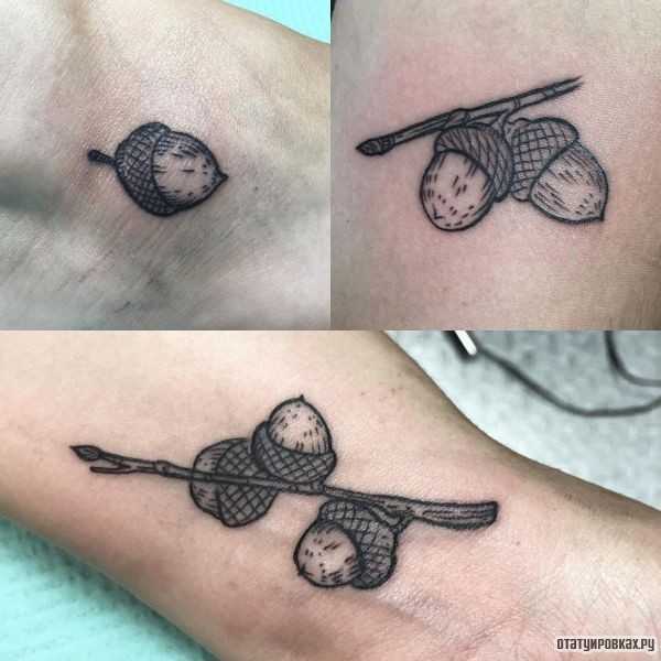 Татуировка с изображением желудя является символом плодородия, продолжения рода, больших возможностей и стойкости на жизненном пути ее обладателя. В древние времена свято верили, что желудь оберегает от нечистой силы и помогает найти выход человеку, который запутался либо, заблудился и не может найти выход из сложившейся ситуации.