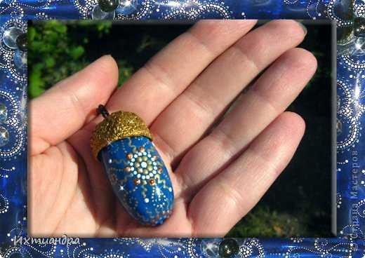 Теперь расскажу о своих работах. Расписные жёлуди на предыдущих фото – использованы акриловые краски и контуры, лак.