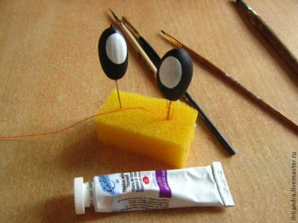 Чтобы было удобно сушить, я использовала кусок поролона. Можно взять пенопласт. После того, как высохнут, нарисовать глазки, клювик и лапки. Закрепить лаком.