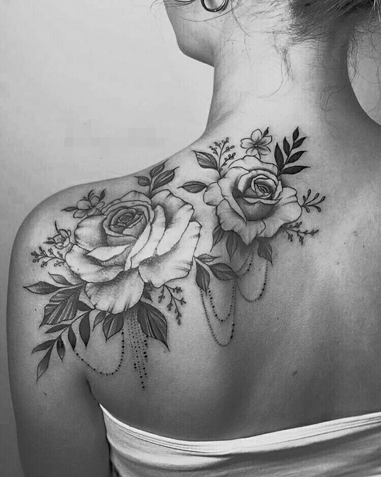 Маленькие татуировки на плечах часто делаются на обоих плечах, а также могут использоваться для создания более крупного рисунка, который проходит вдоль верхней части спины. Зачастую они выглядят очень женственно, так как позволяют подчеркнуть изгибы тела и изящные линии плеч.