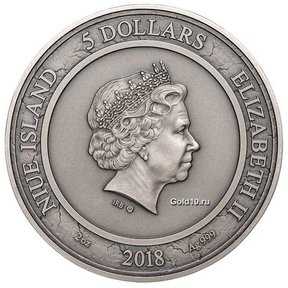 На аверсе монеты, во внутреннем круге, находится портрет Ее Величества королевы Великобритании Елизаветы II работы Иена Рэнк-Бродли (Ian Rank-Broadley FRBS), под которым указаны знак компании Art Mint и инициалы дизайнера. Вдоль края монеты выгравированы надписи – «ELIZABETH II», «Ag 999», «2018», «2oz», «NIUE ISLAND», «5 DOLLARS».