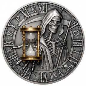 На реверсе серебряной монеты, во внутреннем круге, представлено традиционное западное изображение Смерти в виде скелета с капюшоном и косой (как на монете «Мрачный Жнец»). На монете есть вставка – настоящие песочные часы, которые держит в руке Смерть. Вдоль края монеты расположены римские цифры – как на часовом циферблате. Между ними вставлены буквы из фразы «CARPE DIEM».