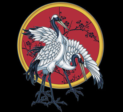 – журавль с распростертыми крыльями и поднятой вверх ногой – как символ Долголетия;