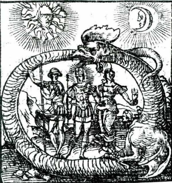 В средневековом романе «Александрия» есть следующие слова: «Охваченный ужасом, я посмотрел и увидел большого змея, свернувшегося в круг и внутри него – совсем маленький круг. И сказал та, которую я встретил: “Знаешь ли ты, что это? Кружок – это земля, а змей – это море, окружающее землю, то есть весь мир”».