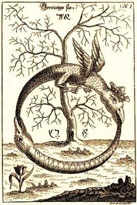 Уроборос. Гравюра Л. Дженниса из книги алхимических эмблем Философский камень. 1625. Символическое принесение в жертву, то есть укус за хвост, Уробороса означает приобщение к вечности в конце Великого Делания.