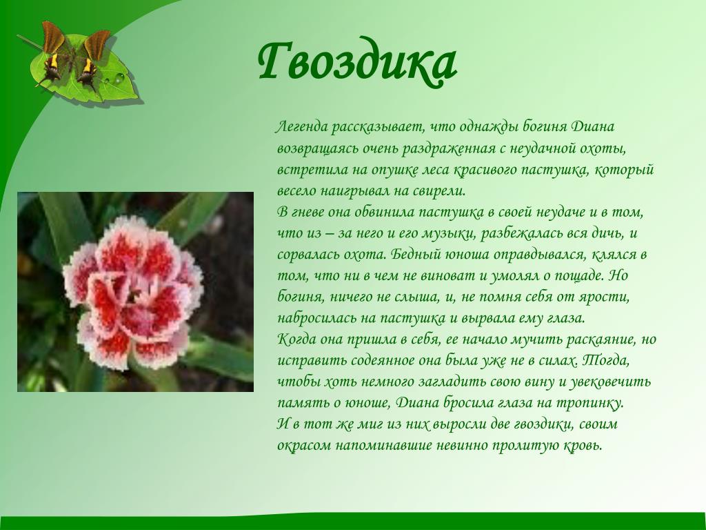ΠΠ²ΠΎΠ·Π΄ΠΈΠΊΠΈ Π½Π°ΡΡΠ½ΠΎΠ΅ Π½Π°Π·Π²Π°Π½ΠΈΠ΅ Dianthus caryophyllus . ΠΠ΅ΠΊΠΎΡΠΎΡΡΠ΅ ΡΡΠΈΡΠ°ΡΡ, ΡΡΠΎ Π½Π°Π·Π²Π°Π½ΠΈΠ΅ Dianthus ΠΏΡΠΎΠΈΠ·ΠΎΡΠ»ΠΎ ΠΎΡ ΠΌΠΈΡΠ° ΠΎ ΠΠΈΠ°Π½Π΅. ΠΡΡΡ Π½Π΅ΡΠΊΠΎΠ»ΡΠΊΠΎ Π²Π°ΡΠΈΠ°ΡΠΈΠΉ ΡΡΠΎΠΉ ΠΈΡΡΠΎΡΠΈΠΈ. Π ΠΎΠ΄Π½ΠΎΠΌ Π²Π°ΡΠΈΠ°Π½ΡΠ΅ Π±ΠΎΠ³ΠΈΠ½Ρ ΠΎΡ ΠΎΡΡ ΠΠΈΠ°Π½Π° Π²ΠΎΠ·Π²ΡΠ°ΡΠ°Π»Π°ΡΡ Ρ Π½Π΅ΡΠ΄Π°ΡΠ½ΠΎΠΉ ΠΎΡ ΠΎΡΡ. ΠΠ½Π° Π½Π°ΡΠΊΠ½ΡΠ»Π°ΡΡ Π½Π° ΠΏΠ°ΡΡΡΡ Π°, ΠΈΠ³ΡΠ°ΡΡΠ΅Π³ΠΎ Π½Π° ΡΠ»Π΅ΠΉΡΠ΅, ΠΈ ΠΎΠ±Π²ΠΈΠ½ΠΈΠ»Π° Π΅Π³ΠΎ ΠΌΡΠ·ΡΠΊΡ Π² ΡΠΎΠΌ, ΡΡΠΎ ΠΎΠ½Π° ΠΈΡΠΏΠΎΡΡΠΈΠ»Π° Π΅ΠΉ ΠΎΡ ΠΎΡΡ.