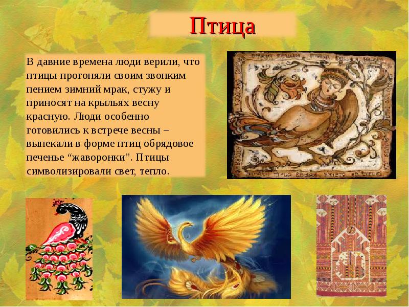 Символы птиц присутствуют в мифологическом, библейском и сказочном сюжете, содержащем варианты о метаморфозе птиц и человека.