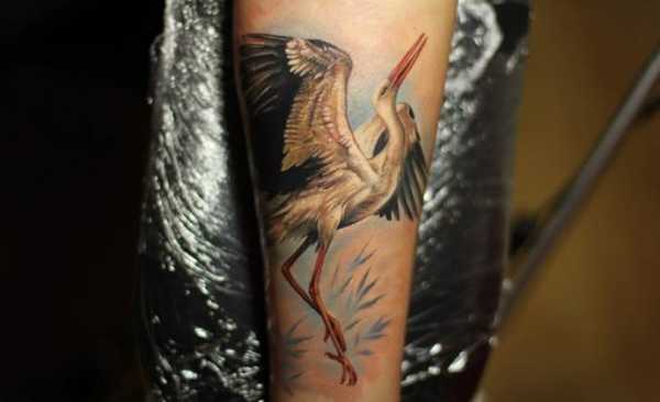 Татуировку с аистом можно сделать, если подобрать хорошее фото для последующего перенесения его на кожу.