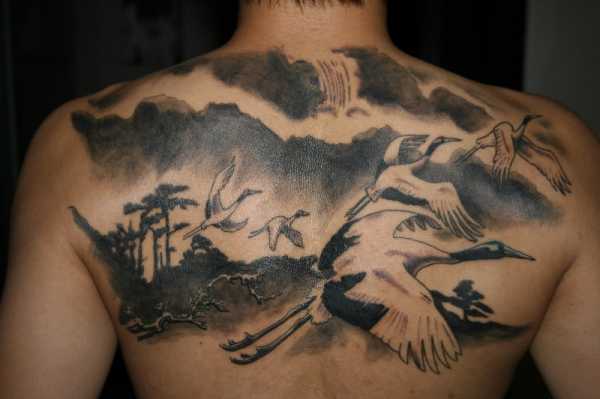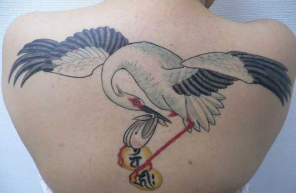 Иногда нательный рисунок в виде горделивого аиста выбирают и мужчина. Нередко они делают татуировку по всей длине спины. Это может быть как красочное изображение, так и тату в черно-белом варианте. Нательный рисунок с аистом для мужчин означает: