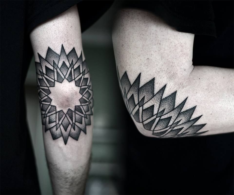 3. Dot & linework Sunburst Design Tattoo on Elbow